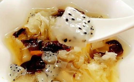 原料:火龙果、银耳、木耳、雪梨。辅料:冰糖、青豆、枸杞。