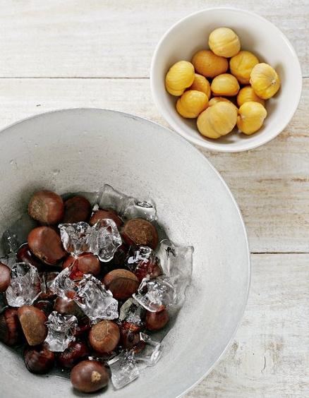 带皮的生栗子在沸水中煮5分钟,捞出后立刻放入有冰块的水中5分钟,这时就很容易剥开栗子皮了。