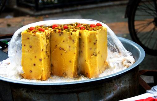 栗子糕是北京汉族特色糕类小吃。以栗子泥夹金糕片和澄沙馅而成。糕分5层,上中下为黄色栗子泥,吕间夹红、褐两色的金糕、澄沙。色泽艳丽,质地松软细腻,香甜适口。