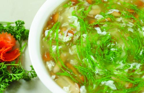 搭配方式:虾仁25克、鸡蛋50克、大米75克、玉米粒25克、豌豆15克、炒豆苗100克,饭后甜点可以是银耳羹、红枣15克。