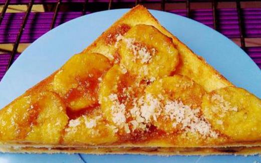 3、香蕉吐司。在吐司上面摆上切片的香蕉,你可以洒好砂糖在进烤箱烤,也可以烤完之后在淋上蜂蜜或枫糖浆!光想就觉得超美味,当早餐一定也很适合。