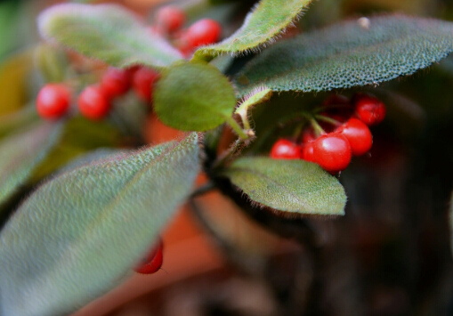 在阳台放置一盆虎舌红,叶片红润并密布舌苔状红色腺点,叶面披满红色的长茸毛,叶茸果红,随着观赏者视角的微微改变而倏然变为斑斓色彩,呈迷幻般的动感多变。球形核果簇生于枝头,与叶片相映成趣,如虎舌舐珠。