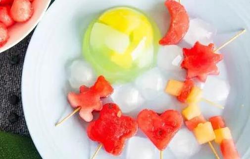 用模具将西瓜做成喜爱的形状,再用签子串起来,或把水果丁串在一起,放在冰箱中冷冻一段时间,口感清爽的不得了!