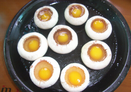 2、将口蘑的根部小心掰掉,用盐和胡椒粉将里外擦一遍,每个口蘑上面打入一个鹌鹑蛋;