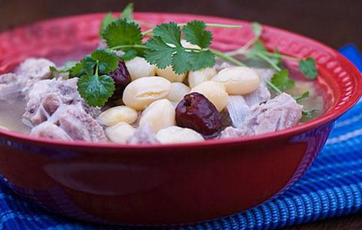 1、小排骨500克,白果30克,调料适量。将小排骨洗净,加黄酒、姜片、水适量,文火焖1.5小时。白果去壳及红衣,加入汤内,加盐调味再煮15分钟,加味精调匀,并撒上青葱末。本方止咳平喘,适用于痰多咳嗽气喘。