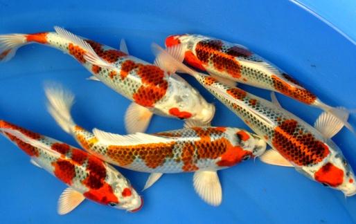 (2)锦水锦鲤在淡蓝色的鱼体上,显露出较多的红色斑纹。