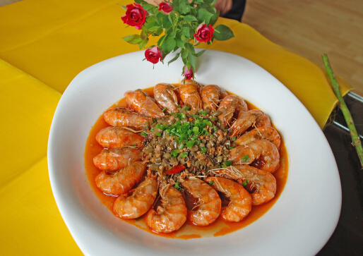 材料:对虾500克,精盐1、5克,青蒜、5克,葱末7、5克,熟猪油50克,姜末7、5克,芝麻油30克,味精、2克,鸡汤100克,白糖、20克。
