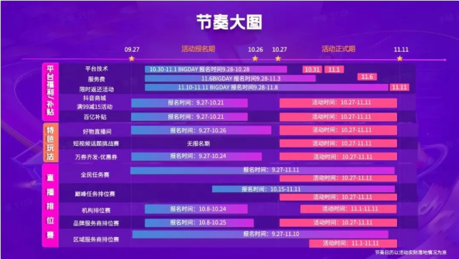 今年抖音电商准备了多重活动玩法,为大力扶持商家、达人,冲刺双十一千亿GMV助力。平台补贴、特色玩法、直播派位三大方面锁流量。
