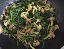 菜花快断生时倒入韭菜炒均匀,并添加适量的盐,酱油,鸡精等调料拌匀即可。