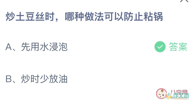 土豆丝是很常见的家常菜,但是炒土豆丝的时候,我们会发现很容易粘锅,这样炒出来的土豆丝也就不怎么好吃。那么炒土豆丝时哪种做法可以防止粘锅?下面作文档小编带来:蚂蚁庄园4月18日答案。