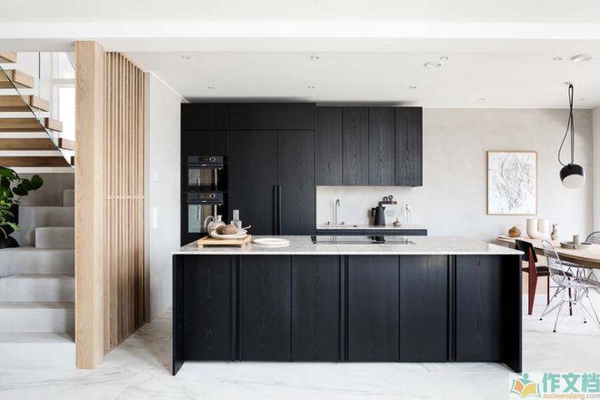 与客厅相对的厨房主要采用黑木纹柜面