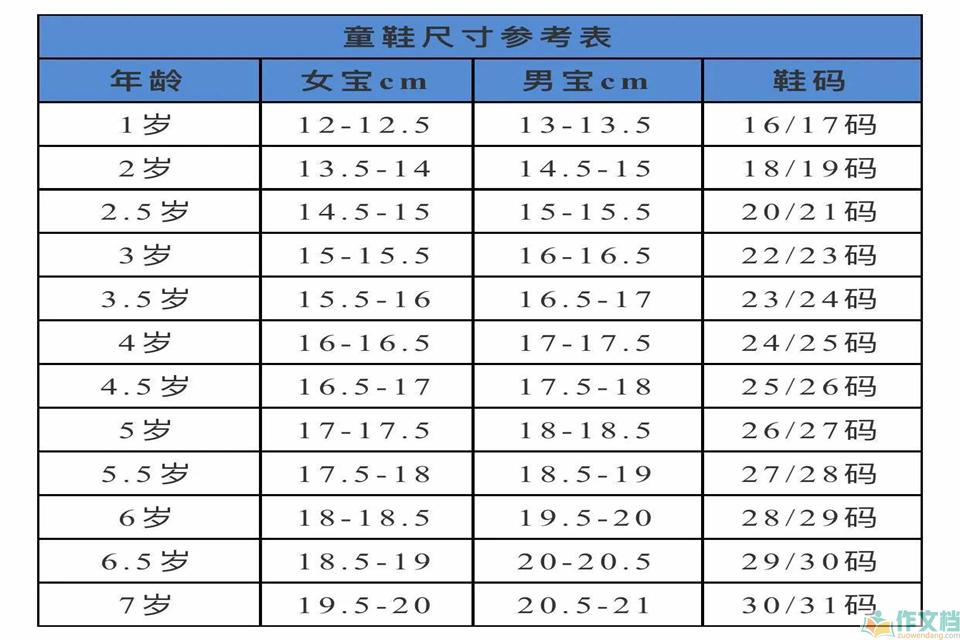 1岁儿童鞋的尺寸是12-13.5cm,对应16/17码;2岁是13.5-15cm,对应18/19码;3岁是15-16.5cm对应20/23码;4岁是16-17.5cm,对应23/25码。