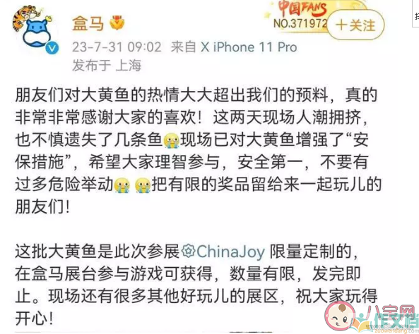 大受欢迎的大黄鱼究竟是何许鱼也?它是盒马为此次ChinaJoy展会定制的系列周边之一,仅在展会期间限时亮相,现场观众参与盒马展台的游戏便可获得,但数量有限,发完即止。