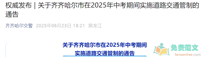 ?无忧考网小编根据齐齐哈尔市公安交通管理局发布”关于齐齐哈尔市在2025年中考期间实施道路交通管制的通告“得知,2025年黑龙江齐齐哈尔中考时间为6月25日-27日,详情如下: