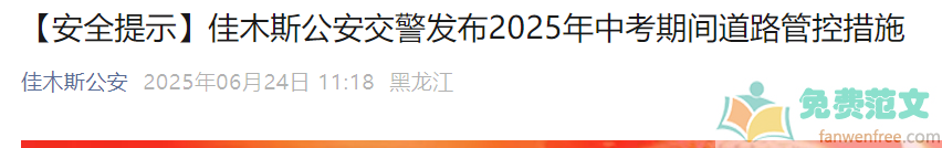 ?无忧考网小编根据佳木斯市公安局发布”佳木斯公安交警发布2025年中考期间道路管控措施“得知,2025年黑龙江佳木斯中考时间6月25日-27日,详情如下: