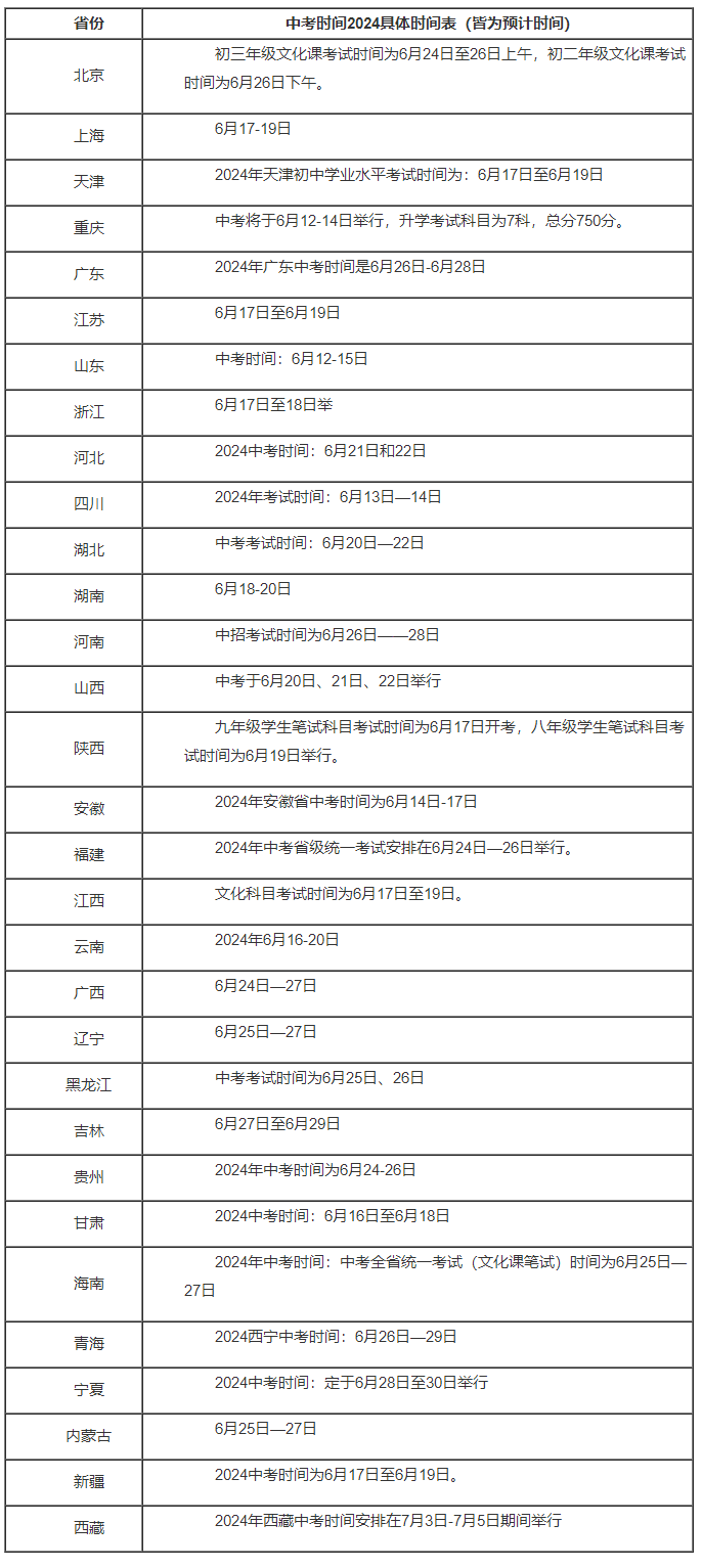 上述时间表是根据往年各地中考时间整理出来的预计时间,从上表看,2024年大部分省市的中考时间都集中在6月15日-6月25日之间,届时,有更详细的时间安排,我们也会更新到本表,直至2024中考时间全部公布完。