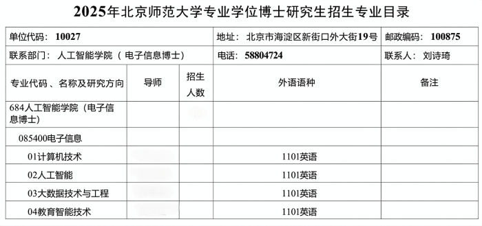 北京师范大学人工智能学院2025年电子信息专业学位博士研究生招生